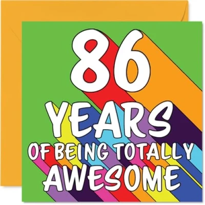 MAKE THEM SMILE WITH THIS UNIQUE BIRTHDAY CARD: This exceptional quality birthday card for him or her shows the design '86 YEARS OF BEING TOTALLY AWESOME'. If you are looking for special birthday greetings cards for Men birthday card then then this happy birthday card is bound to make them smile. Not just for birthday gifts for Men this could also be for Husband, Dad, Grandma, Nan, Nanny, Grandad, Auntie or Uncle. WHAT DO YOU GET: The card is printed on one side and BLANK ON THE INSIDE to allow you to write your very own message. The unique fun design is printed on a specially sourced and environmentally responsible board. At 360 microns thick the natural white one-sided gloss board has a quality look and feel. Supplied with a coloured gummed envelope to complement the design and ready to be sealed and sent in the post. Great Husband birthday cards, Dad birthday card. DESIGNED FOR WRITING: There is nothing worse than writing inside a card to find that the shiny surface makes the ink smudge. This is why we use a high quality one sided coated board. The uncoated side will absorb more of the ink from your pen to make smudging a thing of the past. 86th Birthday card for Grandma, 86th Birthday card for Nan, 86th Birthday card for Nanny. SIZES: Greeting Card = 145mm x 145mm, Envelope = 155mm x 155mm, Card Thickness = 360 micron. Grandad 86th birthday card, birthday cards for Auntie, special birthday cards for Uncle, 86th birthday card Husband, Dad 86th birthday card. MADE AND QUALITY CHECKED IN THE UK: We print and manufacture all our products right here in the UK so you can be sure of a fast turnaround and a product that is expertly made. Using environmentally responsible premium board our card is conscious of the responsible management of the world's forests - perfect birthday cards for Men, fun birthday cards for him, Dad 86th birthday cards, female birthday cards.
