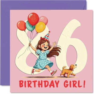 86th Birthday Cards for Women Balloon Girl Happy Card 86 Year Old Woman Nana Nanny Auntie Grandma, 145mm Bday Greeting