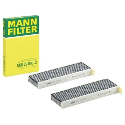 MANN-FILTER Cabin Air Filter CUK 29 003-2 (set of 2) / Dimensions (mm): A = 293; B = 96; H = 32 / Premium Filter in Original Equipment Quality High-quality MANN-FILTER cabin filters with active carbon - nearly 100% protection from particles like pollen, diesel soot & tyre abrasion / Additional protection from harmful gases & unpleasant odour The trated highly-effective activated carbon gives protection against harmful gases such as ozone, nitrogen oxide or sulphur dioxide and eliminates unpleasant odours during the entire service interval Looking to find the correct filter? Select: brand, model, vehicle type, and engine type above to see which one fits your vehicle MANN+HUMMEL complies with REACH-regulation + supports the goal of Improved health and safety through the design, manufacturing, usage, disposal and recycling of our products