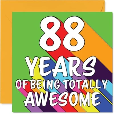MAKE THEM SMILE WITH THIS UNIQUE BIRTHDAY CARD: This exceptional quality birthday card for him or her shows the design '88 YEARS OF BEING TOTALLY AWESOME'. If you are looking for special birthday greetings cards for Men birthday card then then this happy birthday card is bound to make them smile. Not just for birthday gifts for Men this could also be for Grandma, Nan, Nanny, Grandad, Auntie, Uncle, Wife or Husband. WHAT DO YOU GET: The card is printed on one side and BLANK ON THE INSIDE to allow you to write your very own message. The unique fun design is printed on a specially sourced and environmentally responsible board. At 360 microns thick the natural white one-sided gloss board has a quality look and feel. Supplied with a coloured gummed envelope to complement the design and ready to be sealed and sent in the post. Great Grandma birthday cards, Nan birthday card. DESIGNED FOR WRITING: There is nothing worse than writing inside a card to find that the shiny surface makes the ink smudge. This is why we use a high quality one sided coated board. The uncoated side will absorb more of the ink from your pen to make smudging a thing of the past. 88th Birthday card for Nanny, 88th Birthday card for Grandad, 88th Birthday card for Auntie. SIZES: Greeting Card = 145mm x 145mm, Envelope = 155mm x 155mm, Card Thickness = 360 micron. Uncle 88th birthday card, birthday cards for Wife, special birthday cards for Husband, 88th birthday card Grandma, Nan 88th birthday card. MADE AND QUALITY CHECKED IN THE UK: We print and manufacture all our products right here in the UK so you can be sure of a fast turnaround and a product that is expertly made. Using environmentally responsible premium board our card is conscious of the responsible management of the world's forests - perfect birthday cards for Men, fun birthday cards for him, Nan 88th birthday cards, female birthday cards.