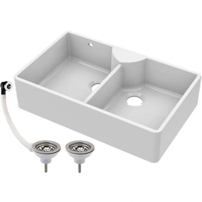ManoManoGeneral description Maximise your kitchen efficiency with this 895mm two-bowl Butler sink featuring a convenient tap ledge and overflow design. Crafted from high-quality fireclay, the stepped weir and dual wastes ensure fast drainage. The overflow and ledge allow easy installation of a tap and prevent spills, combining durability with everyday practicality. This sink fits perfectly with a range of kitchen styles, blending traditional charm with modern elegance. From cosy, vintage kitchens to sleek, modern spaces, its versatile design brings a touch of class to your kitchen. Technical specifications Dimensions: 220 x 895 x 550mm Material: Fireclay Warranty: Sink covered by 10 years, tap by 3 years, and waste by 1 year Installation Apron Front Installation: Classic exposed-front design adds timeless farmhouse style while providing easy access to the sink and simplifying cleanup in busy kitchens. Usage Spacious Double Bowl Design: Dual deep bowls offer flexible workspace for