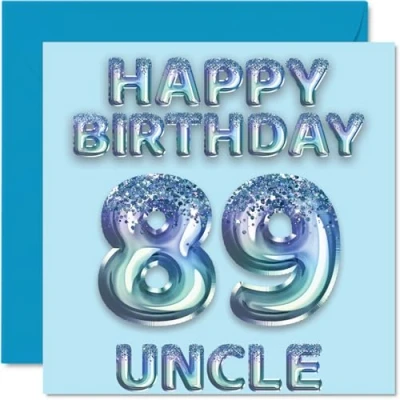 89th Birthday Card for Uncle Blue Glitter Party Balloons Happy Cards 89 Year Old from Nephew Niece, 145mm x Bday Greeting Gift