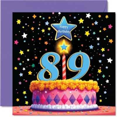 89th Birthday Cards for Women Men Pink Cake & Stars Happy Card 89 Year Old Woman Man Nan Grandma Uncle Auntie, 145mm Bday Greeting
