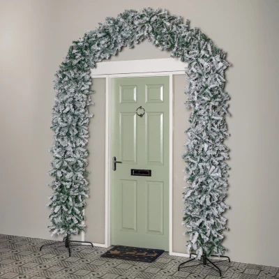 Create a grand and enchanting entrance to your festive celebrations with the Samuel Alexander 8ft Double Door Flocked Christmas Tree Arch. A stunning centrepiece designed to transform any doorway, hallway, or event space into a magical winter wonderland.. This beautifully designed double door tree archway features an impressive 2000 lush branch tips, crafted from high quality materials for a lifelike, realistic appearance. Each branch is lightly coated with a delicate layer of snow flock, adding a soft, wintry touch reminiscent of freshly fallen snow. The result is a full and elegant display that perfectly captures the charm and serenity of the festive season.. Supported by green metal stands at the base of each pillar, the structure is both sturdy and stylish, ensuring stability while maintaining a natural, tree like look. With an external height of 265 cm and an external length of 210 cm, this grand archway makes a dramatic and memorable statement piece. Ideal for framing doorways, entrances, or creating a photo-worthy feature at Christmas gatherings and events.. Please note; the branches of the archway will require to be fluffed and rearranged to achieve the appearance in our product images.. Suitable for indoor and sheltered outdoor use.. Product Specifications. External Height: 8ft (2.60m) Length: 210cm Width: 42cm. Internal Height: 2.40m Length: 1.30m Width: 42cm. Green Metal Stand Diameter: 60cm