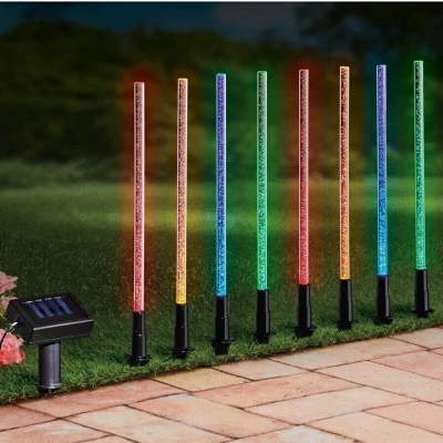 General description Light up your outdoor spaces with this 8-piece Solar Garden Lights Set. Standing approximately 46 cm tall with 31 cm spacing and a total cable length of 200 cm, these bubble-effect solar stake lights add elegance and ambience to gardens, pathways, patios, and driveways. Powered by solar energy with dusk-to-dawn sensors, they provide effortless illumination without the need for wiring or switches. Technical specifications Height: 46 cm per light Spacing between lights: 31 cm Total cable length: 200 cm Material: ABS plastic Power source: solar panel with dusk-to-dawn sensor Weatherproof: waterproof, UV-resistant, and frost-proof Usage Pathway lights: create a glowing guide along garden paths and driveways. Patio & decking: add ambience to evening gatherings and outdoor dining. Garden borders: highlight flowerbeds, ponds, or decorative garden features. Low-maintenance: automatic dusk-to-dawn operation with no ongoing effort required. Other information Unique bubble