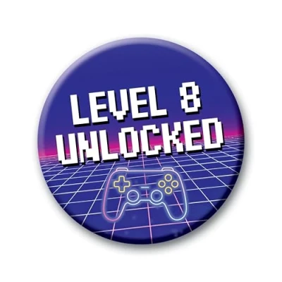 8th Birthday Badge 76mm Level 8 Unlocked Pin Button Video Game Gift for Boys