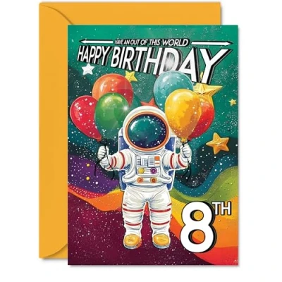 8th Birthday Card Boy Astronaut Spacesuit Outer Space for 8 Year Old Girl, Age Boys Girls Cards, A5 Bday Greeting
