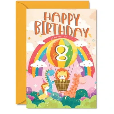 8th Birthday Card Girls Boys Hot Air Balloon Rainbow Happy for 8 Year Old Girl Boy Kids, A5 Eight Eighth Bday Animal Greeting Cards