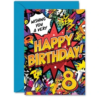 8th Birthday Cards for Boys Girls Comic Book Pow! Happy Card 8 Year Old Boy Girl Daughter Nephew Cousin Grandson, A5 Bday Greeting