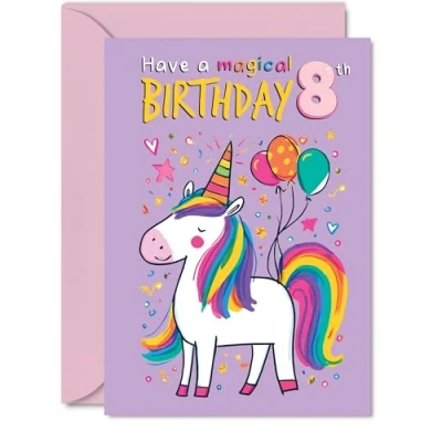 MAKE THEM SMILE WITH THIS UNIQUE BIRTHDAY CARD: This exceptional quality birthday card for him or her shows the design 'Have a Magical 8th Birthday'. If you are looking for special birthday greetings cards for Boys birthday card then then this happy birthday card is bound to make them smile. Not just for birthday gifts for Boys this could also be for Grandson, Cousin, Daughter, Nephew, Sister, Granddaughter, Brother or Niece. WHAT DO YOU GET: The cards are printed on both sides with the inside print saying 'Youre so Uni-Cool!' and ample space for your own personal message. The unique fun design is printed on a specially sourced and environmentally responsible board. At 360 microns thick the natural white one-sided gloss board has a quality look and feel. Supplied with a coloured gummed envelope to complement the design and ready to be sealed and sent in the post. NO INK SMUDGES: There is nothing worse than writing inside a card to find that the shiny surface makes the ink smudge. This is why we use a high quality one sided coated board. The uncoated side will absorb more of the ink from your pen to make smudging a thing of the past. 8th Birthday card for Daughter, 8th Birthday card for Nephew, 8th Birthday card for Sister. SIZES: Greeting Card = 127mm x 178mm, Envelope = 130mm x 180mm, Card Thickness = 360 micron. Granddaughter 8th birthday card, birthday cards for Brother, special birthday cards for Niece, 8th birthday card Grandson, Cousin 8th birthday card. MADE AND QUALITY CHECKED IN THE UK: We print and manufacture all our products right here in the UK so you can be sure of a fast turnaround and a product that is expertly made. Using environmentally responsible premium board our card is conscious of the responsible management of the world's forests - perfect birthday cards for Boys, fun birthday cards for him, Cousin 8th birthday cards, female birthday cards.