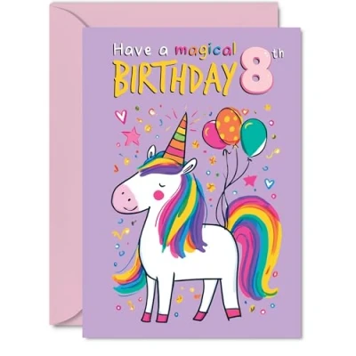 MAKE THEM SMILE WITH THIS UNIQUE BIRTHDAY CARD: This exceptional quality birthday card for him or her shows the design 'Have a Magical 8th Birthday'. If you are looking for special birthday greetings cards for Boys birthday card then then this happy birthday card is bound to make them smile. Not just for birthday gifts for Boys this could also be for Grandson, Cousin, Daughter, Nephew, Sister, Granddaughter, Brother or Niece. WHAT DO YOU GET: The cards are printed on both sides with the inside print saying 'Youre so Uni-Cool!' and ample space for your own personal message. The unique fun design is printed on a specially sourced and environmentally responsible board. At 360 microns thick the natural white one-sided gloss board has a quality look and feel. Supplied with a coloured gummed envelope to complement the design and ready to be sealed and sent in the post. NO INK SMUDGES: There is nothing worse than writing inside a card to find that the shiny surface makes the ink smudge. This is why we use a high quality one sided coated board. The uncoated side will absorb more of the ink from your pen to make smudging a thing of the past. 8th Birthday card for Daughter, 8th Birthday card for Nephew, 8th Birthday card for Sister. SIZES: Greeting Card = 148mm x 210mm, Envelope = 150mm x 212mm, Card Thickness = 360 micron. Granddaughter 8th birthday card, birthday cards for Brother, special birthday cards for Niece, 8th birthday card Grandson, Cousin 8th birthday card. MADE AND QUALITY CHECKED IN THE UK: We print and manufacture all our products right here in the UK so you can be sure of a fast turnaround and a product that is expertly made. Using environmentally responsible premium board our card is conscious of the responsible management of the world's forests - perfect birthday cards for Boys, fun birthday cards for him, Cousin 8th birthday cards, female birthday cards.
