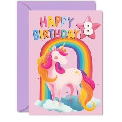 8th Birthday Cards for Boys Girls Rainbow Unicorn Happy Card 8 Year Old Boy Girl Daughter Nephew Cousin Grandson, 5x7 Inch Bday Greeting