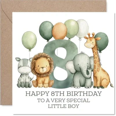 8th Birthday Cards for Boys Jungle Numbers Happy Card 8 Year Old Boy Godson Step Son Brother, 145mm Bday Greeting