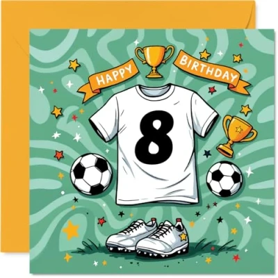 8th Birthday Cards for Girls Boys Football Shirt Happy Card 8 Year Old Girl Boy Daughter Nephew Cousin Grandson, 145mm Bday Greeting