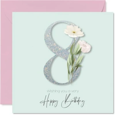 MAKE HER SMILE WITH THIS UNIQUE BIRTHDAY CARD: This exceptional quality birthday card for her shows the design '8 Wishing You A Very Happy Birthday'. If you are looking for special birthday greetings cards for Girls birthday card then then this happy birthday card is bound to make her smile. Not just for birthday gifts for Girls this could also be for Great Niece, Daughter, Niece, Step Daughter, Cousin, Sister, Granddaughter or Goddaughter. WHAT DO YOU GET: The card is printed on one side and BLANK ON THE INSIDE to allow you to write your very own message. The unique fun design is printed on a specially sourced and environmentally responsible board. At 360 microns thick the natural white one-sided gloss board has a quality look and feel. Supplied with a coloured gummed envelope to complement the design and ready to be sealed and sent in the post. Great Great Niece birthday cards, 8th birthday card, Daughter birthday card. NO INK SMUDGES: There is nothing worse than writing inside a card to find that the shiny surface makes the ink smudge. This is why we use a high quality one sided coated board. The uncoated side will absorb more of the ink from your pen to make smudging a thing of the past. 8th Birthday card for Niece, 8th Birthday card for Step Daughter, 8th Birthday card for Cousin. SIZES: Greeting Card = 145mm x 145mm, Envelope = 155mm x 155mm, Card Thickness = 360 micron. Sister 8th birthday card, birthday cards for Granddaughter, cute birthday cards for Goddaughter, 8th birthday card Great Niece, Daughter 8th birthday card. MADE AND QUALITY CHECKED IN THE UK: We print and manufacture all our products right here in the UK so you can be sure of a fast turnaround and a product that is expertly made. Using environmentally responsible premium board our card is conscious of the responsible management of the world's forests - perfect birthday cards for Girls, fun birthday cards for her, Daughter 8th birthday cards, female birthday cards.