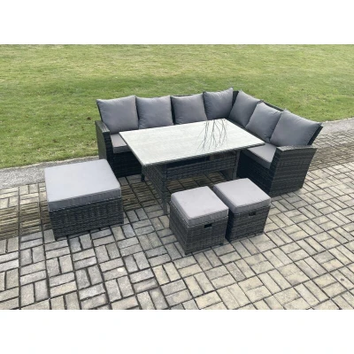 General description This patio corner sofa set is designed for both indoor and outdoor use, featuring high-quality PE rattan and a durable galvanized steel construction that ensures sturdiness and longevity. The elegant design blends country chic with modern minimalism, making it a stylish addition to any space, whether on the patio, balcony, or indoors. Technical specifications Big footstool dimensions: 65L x 65W x 34H cm Small footstool dimensions: 40L x 40W x 34H cm (2 units) 3-seater sofa with two arms dimensions: 170L x 69D x 79H cm 3-seater sofa with single arm dimensions: 160L x 69D x 79H cm Dining table dimensions: 140L x 80W x 70H cm (with transparent tempered glass) Seat cushion thickness: 8 cm Installation Items come flat packed and are easy to assemble. Usage Keep the cushions indoors or use a rain cover when not in use. Use a rain cover to protect the furniture if not used for an extended period. Other information Dark grey mixed rattan with dark grey fabric; color may