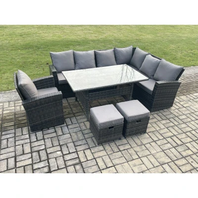 9 Seater Garden Rattan Furniture Corner Sofa Dining Table Set with 2 Small Footstools Armchair Indoor Outdoor Lounge Fimous