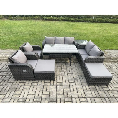 9 Seater Garden Rattan Furniture Dining Table Sofa Set Indoor Outdoor with 2 Reclining Chairs Side Tables Big Footstool Dark Grey Mixed Fimous