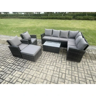 9 Seater High Back Outdoor Garden Furniture Set Rattan Corner Sofa With Rectangular Coffee Table Big Footstool 2 Armchairs Dark Grey Mixed