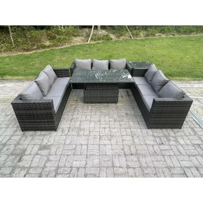 9 Seater Outdoor Rattan Garden Furniture Sofa Set Patio Adjustable Rising Lifting Dining Table with Side Dark Grey Mixed Fimous