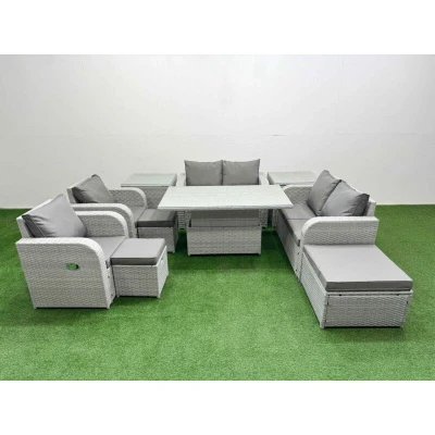General description This deluxe PE rattan sofa set is a great addition to your patio or garden, made of high-quality PE rattan and durable galvanized steel. The set includes adjustable reclining chairs, a lifting dining or coffee table, stools, and side tables, providing both comfort and functionality for outdoor gatherings. Technical specifications 2 x Reclining chairs Size: 74W x 69D x 79H cm 2 x Love Sofa Size: 124W x 67D x 79H cm 1 x Big footstool Size: 65L x 65W x 34H cm 2 x Fully Assembled Stools Size: 40W x 40D x 34H cm 2 x Side table Size: 65L x 65W x 66H cm 1 x Lifting Table Size: 140L x 80W x 68/48H cm (height adjustable from 68 to 48 cm) Sofa Weight Capacity: 250 kg Table Weight Capacity: 80 kg Color: Light grey rattan with dark grey fabric Installation Items come flat packed and are easy to assemble. Usage Adjustable reclining chairs allow you to set the backrest inclination from 90° to 130°. Low maintenance with removable cushion covers. Recommended to keep cushions