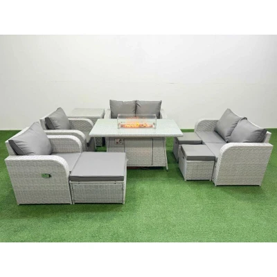 General description This Fimous 9 Seater Outdoor Reclining Chair Love Sofa Set is a stylish and comfortable addition to your garden or patio. Made from light grey rattan with dark grey fabric, this set includes two reclining chairs, two love sofas, a big footstool, two stools, a side table, and a firepit dining table. The adjustable armchairs allow you to customize your seating position for maximum comfort. Technical specifications Set dimensions: 2 x Reclining chairs: 74W x 69D x 79H cm 2 x Love Sofa: 124W x 67D x 79H cm 1 x Big footstool: 65L x 65W x 34H cm 2 x Fully Assembled Stools: 40W x 40D x 34H cm 1 x Side table: 65L x 65W x 66H cm 1 x Firepit Dining Table: 140L x 80W x 69H cm Sofa Weight Capacity: 250kg Table Weight Capacity: 80kg Material: Galvanized steel tube frames with powder coating, PE rattan, 5mm thick tempered glass Cushion thickness: 8 cm Installation Items come flat packed and are easy to assemble. Usage Recommended to use a 5 kg gas tank for the fire pit. Check
