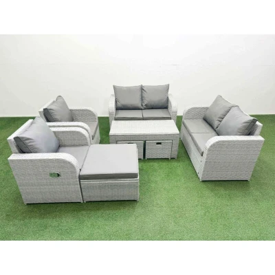 General description This deluxe PE rattan sofa set is a great addition to your patio or garden, made of high-quality PE rattan and durable galvanized steel. The set includes reclining chairs, a love sofa, stools, and a coffee table, providing both comfort and style for outdoor relaxation. Technical specifications 2 x Reclining chairs Size: 74W x 69D x 79H cm 2 x Love Sofa Size: 124W x 67D x 79H cm 1 x Big footstool Size: 65L x 65W x 34H cm 2 x Fully Assembled Stools Size: 40W x 40D x 34H cm 1 x Table Size: 105L x 50W x 48H cm Sofa Weight Capacity: 250kg Table Weight Capacity: 80kg Color: Light grey rattan with dark grey fabric Installation Items come flat packed and are easy to assemble. Usage The 2 armchairs are adjustable, allowing you to change the inclination of the chair back from 90° to 130°. Low maintenance with removable cushion covers. Recommended to keep cushions indoors or use a rain cover when not in use. Other information 5mm thick transparent tempered glass with suckers