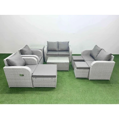 9 Seater Outdoor Reclining Chair Love Sofa Set Rattan Garden Furniture with Rectangular Coffee Table 3 Stools Side Light Grey Fimous