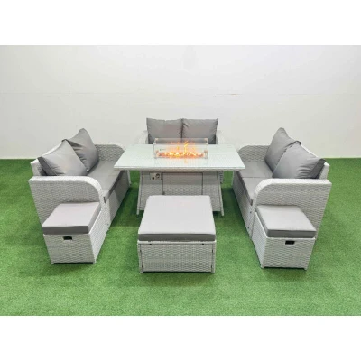 General description This Fimous 9 Seater PE Wicker Rattan Furniture Sofa Set includes a firepit dining table, a 2-seater love sofa, and three stools, all designed for comfort and style. The set features a light grey PE rattan finish complemented by dark grey fabric cushions, providing a modern look for your outdoor space. Technical specifications 3 x Love Sofa Size: 124W x 67D x 79H cm 1 x Big Footstool: 65L x 65W x 34H cm 2 x Fully Assembled Stools: 40W x 40D x 34H cm 1 x Firepit Dining Table Size: 140L x 80W x 69H cm 8 cm Thick Seat Cushion with Soft Pillow Back Cushion Material: Light grey PE rattan with dark grey fabric 5mm Thickness Transparent Tempered Glass Installation Items come flat packed and are easy to assemble. Sturdy galvanized steel tube metal frames with powder coating to prevent rust. Usage Place the gas fire pit on the glass top, not under it. Do not cover the igniter with lava rocks. Check for any gas leaks at the joints or hose before use. Keep the cushions