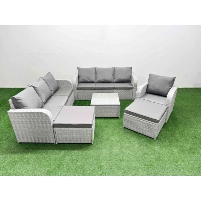 General description This deluxe PE rattan sofa set is an excellent addition to your patio or garden, crafted from high-quality PE rattan and durable galvanized steel. The set includes a square coffee table, two 3-seater sofas, two reclining chairs, and two big footstools, all designed for comfort and style. Technical specifications Reclining Chair Size: 74W x 69D x 79H cm 3 Seater Sofa Size: 177W x 67D x 79H cm (2 units) Big Footstool Size: 65L x 65W x 34H cm (2 units) Table Size: 65L x 65W x 34H cm Sofa Weight Capacity: 250kg Table Weight Capacity: 80kg Color: Light grey rattan with dark grey fabric Seat Cushion Thickness: 8 cm Glass Thickness: 5 mm (tempered glass) Installation Items come flat packed and are easy to assemble. Usage Low maintenance with removable cushion covers. Keep cushions indoors or use a rain cover when not in use. Use a rain cover for the furniture if not in use for an extended period. Other information Adjustable reclining chairs with a back inclination range