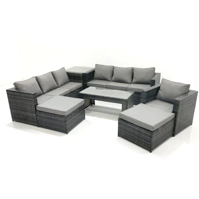 General description This Fimous 9 Seater Rattan Garden Outdoor Furniture Set features a stylish design that combines country chic with modern minimalism, making it a perfect addition to your indoor or outdoor space. Crafted from high-quality PE rattan and durable galvanized steel, this furniture set is built for sturdiness and longevity. It can be placed on patios, balconies, or gardens, adding an elegant touch to your home. Technical specifications Set Dimensions: 2 x Double armrest Sofa Size: 176W x 65D x 66H cm 1 x Chair: 74W x 65D x 66H cm 1 x Side Table: 65W x 65D x 66H cm 2 x Big Footstool: 65W x 65D x 34H cm 1 x Oblong Coffee Table: 105L x 50W x 48H cm Sofa Weight Capacity: 250 kg Color: Dark grey mixed PE Rattan Installation Items come flat packed and are easy to assemble. Sturdy galvanized steel tube metal frames with powder coating to prevent rust. Usage Low maintenance with removable cushion covers. Keep cushions indoors or use a rain cover when not in use. Use a rain cover
