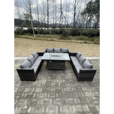 9 Seater U Shape Outdoor Lounge Rattan Sofa Set Garden Furniture Gas Firepit Dining Table Dark Grey Mixed Fimous
