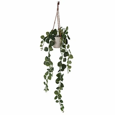 General description This 90cm Artificial Potted Trailing Hanging Natural Look Plant is a realistic replica of the Ceropegia woodii, commonly known as the String of Hearts. It comes potted in a decorative white plastic hanging pot with jute string attachments, making it ready to display in your home. Technical specifications Overall dimensions including hanging strings: 90cm tall x 20cm x 20cm Small plastic pot dimensions: 10cm (w) x 9cm (h) Leaves material: Silk Stems material: Plastic Other information This product is designed for indoor use only.