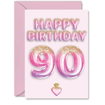 90th Birthday Cards for Men Women Pink & Purple Glitter Balloons Happy Card 90 Year Old Man Woman Auntie Uncle Grandad Nanny, A5 Bday Greeting