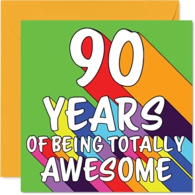 MAKE THEM SMILE WITH THIS UNIQUE BIRTHDAY CARD: This exceptional quality birthday card for him or her shows the design '90 YEARS OF BEING TOTALLY AWESOME'. If you are looking for special birthday greetings cards for Men birthday card then then this happy birthday card is bound to make them smile. Not just for birthday gifts for Men this could also be for Nanny, Grandad, Auntie, Uncle, Wife, Husband, Dad or Grandma. WHAT DO YOU GET: The card is printed on one side and BLANK ON THE INSIDE to allow you to write your very own message. The unique fun design is printed on a specially sourced and environmentally responsible board. At 360 microns thick the natural white one-sided gloss board has a quality look and feel. Supplied with a coloured gummed envelope to complement the design and ready to be sealed and sent in the post. Great Nanny birthday cards, Grandad birthday card. DESIGNED FOR WRITING: There is nothing worse than writing inside a card to find that the shiny surface makes the ink smudge. This is why we use a high quality one sided coated board. The uncoated side will absorb more of the ink from your pen to make smudging a thing of the past. 90th Birthday card for Auntie, 90th Birthday card for Uncle, 90th Birthday card for Wife. SIZES: Greeting Card = 145mm x 145mm, Envelope = 155mm x 155mm, Card Thickness = 360 micron. Husband 90th birthday card, birthday cards for Dad, special birthday cards for Grandma, 90th birthday card Nanny, Grandad 90th birthday card. MADE AND QUALITY CHECKED IN THE UK: We print and manufacture all our products right here in the UK so you can be sure of a fast turnaround and a product that is expertly made. Using environmentally responsible premium board our card is conscious of the responsible management of the world's forests - perfect birthday cards for Men, fun birthday cards for him, Grandad 90th birthday cards, female birthday cards.