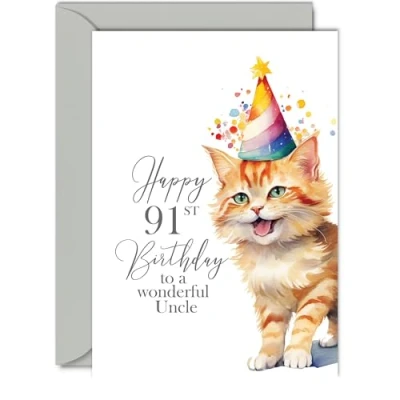 Make them smile with this special birthday card - This exceptional quality birthday card for him shows the design Party Cat Kitten saying 'Happy 91st Birthday'. If you are looking for awesome birthday greetings cards for men or 91st birthday card for him then then this happy birthday card is bound to make him smile. Not just for friendship gifts for men this could also be for Uncle, Step Uncle or Uncle in Law. What's Inside - Print showcasing a lovely verse, 'Wishing You A Very Happy Birthday' as seen in the second image. There's ample space for your own personal message. Crafted on a 360-micron thick environmentally responsible board, this one-sided gloss board offers a luxurious look and feel. Paired with a colored gummed envelope that complements the design, it's ready to be sealed and sent, making it a truly special birthday gesture. Ink Perfection: Say goodbye to ink smudges! Our high-quality one-sided coated board ensures a smooth writing experience without the worry of smudging. The uncoated side absorbs ink, providing a flawless finish that adds to the card's overall premium quality.Uncle birthday card adult, 91st birthday card Uncle, special Uncle birthday cards, Uncle 91st birthday cards, male birthday cards. Dimensions that Impress: Greet with grandeur using a card sized at 148mm x 210mm, accompanied by an envelope measuring 150mm x 212mm. The card boasts a thickness of 360 microns, ensuring a substantial and impressive presence.Uncle birthday cards from Niece or Nephew. Great Uncle card birthday, Uncle birthday cards for men, happy birthday Uncle, Uncles birthday card from kids. British Craftsmanship: Proudly crafted and quality-checked in the UK, our birthday cards are a testament to expert design and manufacturing. Utilizing Forest Stewardship Council certified board, we contribute to responsible forest management. Expect a swift turnaround and a product that reflects the highest standards of quality. Wonderful Uncle birthday cards, brilliant male birthday cards.