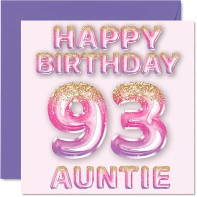 93rd Birthday Card for Auntie Pink & Purple Glitter Balloons Happy Cards 93 Year Old Aunt Aunty from Nephew Niece, 145mm x Bday Greeting Gift