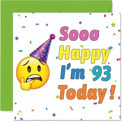MAKE THEM SMILE WITH THIS UNIQUE BIRTHDAY CARD: This exceptional quality birthday card for him or her shows the design 'So Happy Im 93 Today'. If you are looking for special birthday greetings cards for Men birthday card then then this happy birthday card is bound to make them smile. Not just for birthday gifts for Men this could also be for Uncle, Wife, Husband, Dad, Grandma, Nan, Nanny or Grandad. WHAT DO YOU GET: The card is printed on one side and BLANK ON THE INSIDE to allow you to write your very own message. The unique fun design is printed on a specially sourced and environmentally responsible board. At 360 microns thick the natural white one-sided gloss board has a quality look and feel. Supplied with a coloured gummed envelope to complement the design and ready to be sealed and sent in the post. Great Uncle birthday cards, Wife birthday card. DESIGNED FOR WRITING: There is nothing worse than writing inside a card to find that the shiny surface makes the ink smudge. This is why we use a high quality one sided coated board. The uncoated side will absorb more of the ink from your pen to make smudging a thing of the past. 93rd Birthday card for Husband, 93rd Birthday card for Dad, 93rd Birthday card for Grandma. SIZES: Greeting Card = 145mm x 145mm, Envelope = 155mm x 155mm, Card Thickness = 360 micron. Nan 93rd birthday card, birthday cards for Nanny, special birthday cards for Grandad, 93rd birthday card Uncle, Wife 93rd birthday card. MADE AND QUALITY CHECKED IN THE UK: We print and manufacture all our products right here in the UK so you can be sure of a fast turnaround and a product that is expertly made. Using environmentally responsible premium board our card is conscious of the responsible management of the world's forests - perfect birthday cards for Men, fun birthday cards for him, Wife 93rd birthday cards, female birthday cards.