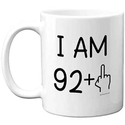 MAKE THEM SMILE ON THEIR 93rd: This exceptional quality birthday gift for her or him shows the design 'I AM 92 + Middle Finger'. If you are looking for funny birthday mugs for men or women, then this happy birthday secret santa mug is bound to make them laugh. Not just for friendship gifts for men this could also be for Best Friend, Work Colleague, Mum, Grandma, Nan, Dad, Grandad, Nanny, Brother, Sister, Auntie or Uncle. WHAT DO YOU GET: This novelty mug for him or her is made from the highest quality mugs available on the market. An 11oz ceramic gloss finished mug with a large handle for ease of use. The cheeky design is printed on both sides so no one will miss it. Incredibly funny Secret Santa gifts from Stuff4 Ltd. prank birthday gifts, Dad birthday gift, rude birthday gifts, joke birthday gifts, gag birthday gift. PACKED FOR PROTECTION: Every order is packed in a drop proof double walled cardboard Mug Mailer which are lightweight and strong enough to provide total protection. So have the birthday boy in pieces and not the rude mugs. Grandad birthday gifts, Brother birthday gifts, best friend birthday gift, birthday gift funny, rude birthday gifts for men, funny christmas gifts, rude christmas present idea. MADE AND QUALITY CHECKED IN THE UK: We manufacture all our product right her in the UK so you can be sure of a fast turnaround and a product that is expertly made - for his birthday gifts. Great friend birthday gifts, male birthday gifts, 93rd birthday gift, happy birthday Grandad gifts, Grandma 93rd birthday gifts, Mum 93rd birthday gift, Dad 93rd birthday gift, Nan 93rd birthday gift, Granny 93rd birthday gift. 11oz DISHWASHER AND MICROWAVE SAFE MUGS: Made from premium ceramic our 11oz heavyweight mugs are manufactured with a dishwasher safe premium coating. This means that the colours of your image will not fade from even after multiple cycles (up to 800) through a dishwasher. They are also microwave safe. 93rd birthday gifts for men, mens birthday gifts, oldi gift, xmas gifts mugs.