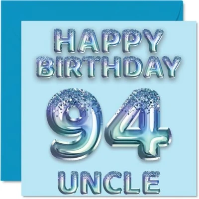 MAKE YOUR UNCLE SMILE WITH THIS AWESOME BIRTHDAY CARD: This exceptional quality birthday card for him shows the design of blue glitter balloons stating 'Happy Birthday 94' Uncle'. If you are looking for funny birthday cards for men, then then this happy birthday card is bound to make them laugh. Not just for friendship gifts for men this could also be for Uncle or Step Uncle. WHAT DO YOU GET: The card is printed on one side and BLANK ON THE INSIDE to allow you to write your very own message. The unique fun design is printed on a specially sourced and environmentally responsible board. At 360 microns thick the natural white one-sided gloss board has a quality look and feel. Supplied with a coloured gummed envelope to complement the design and ready to be sealed and sent in the post. Birthday card for Uncle, 94th birthday card for him. NO INK SMUDGES: There is nothing worse than writing inside a card to find that the shiny surface makes the ink smudge. This is why we use a high quality one sided coated board. The uncoated side will absorb more of the ink from your pen to make smudging a thing of the past. Uncle birthday cards, birthday card cute, 94th birthday gifts for Uncle, Uncle birthday cards. SIZES: Greeting Card = 145mm x 145mm, Envelope = 155mm x 155mm, Card Thickness = 360 micron. Great Uncle birthday cards from Niece and Nephew, male birthday card, 94th birthday card, happy birthday Uncle cards, family birthday card. MADE AND QUALITY CHECKED IN THE UK: We print and manufacture all our product right her in the UK so you can be sure of a fast turnaround and a product that is expertly made. Using environmentally responsible premium board our card is conscious of the responsible management of the world's forests.