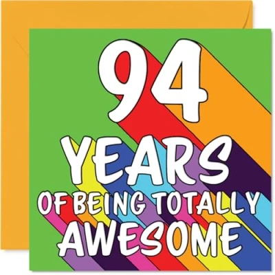 MAKE THEM SMILE WITH THIS UNIQUE BIRTHDAY CARD: This exceptional quality birthday card for him or her shows the design '94 YEARS OF BEING TOTALLY AWESOME'. If you are looking for special birthday greetings cards for Men birthday card then then this happy birthday card is bound to make them smile. Not just for birthday gifts for Men this could also be for Wife, Husband, Dad, Grandma, Nan, Nanny, Grandad or Auntie. WHAT DO YOU GET: The card is printed on one side and BLANK ON THE INSIDE to allow you to write your very own message. The unique fun design is printed on a specially sourced and environmentally responsible board. At 360 microns thick the natural white one-sided gloss board has a quality look and feel. Supplied with a coloured gummed envelope to complement the design and ready to be sealed and sent in the post. Great Wife birthday cards, Husband birthday card. DESIGNED FOR WRITING: There is nothing worse than writing inside a card to find that the shiny surface makes the ink smudge. This is why we use a high quality one sided coated board. The uncoated side will absorb more of the ink from your pen to make smudging a thing of the past. 94th Birthday card for Dad, 94th Birthday card for Grandma, 94th Birthday card for Nan. SIZES: Greeting Card = 145mm x 145mm, Envelope = 155mm x 155mm, Card Thickness = 360 micron. Nanny 94th birthday card, birthday cards for Grandad, special birthday cards for Auntie, 94th birthday card Wife, Husband 94th birthday card. MADE AND QUALITY CHECKED IN THE UK: We print and manufacture all our products right here in the UK so you can be sure of a fast turnaround and a product that is expertly made. Using environmentally responsible premium board our card is conscious of the responsible management of the world's forests - perfect birthday cards for Men, fun birthday cards for him, Husband 94th birthday cards, female birthday cards.