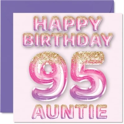 95th Birthday Card for Auntie Pink & Purple Glitter Balloons Happy Cards 95 Year Old Aunt Aunty from Nephew Niece, 145mm x Bday Greeting Gift