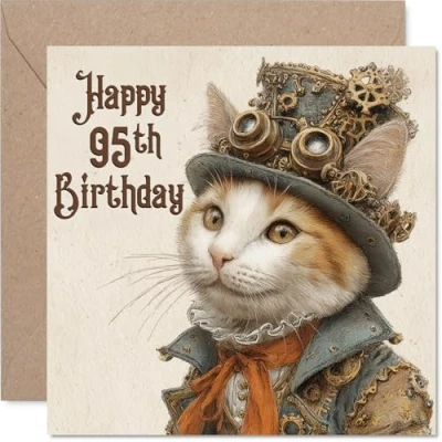 95th Birthday Cards for Men Women Steam Punk Cat Happy Card 95 Year Old Man Woman Dad Wife Nan Uncle, 145mm Bday Greeting