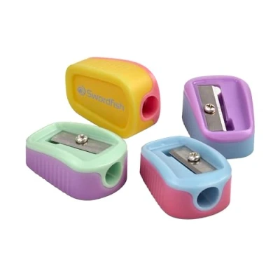 Duo Wedge introduces complementary pastel colour combinations which are soft & fun Single-hole pencil sharpener suitable for sharpening standard 8mm writing, colouring and art pencils Easy to hold ergonomic shape provides a comfortable grip allowing you to sharpen for long periods of time without any unwanted discomfort Inset, fully encased blade with no accessible sharp edges Available in assorted soft pastel colours – green/purple, pink/yellow, purple/blue & blue/pink