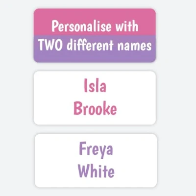 ⭐2 Names on One Sheet - 96 labels in total, 48 labels per child Perfect for siblings or twins — personalise labels with 2 children’s names and save money. 48 labels have pink text and 48 labels have purple text. Labels measure 30mm x 13mm. ⭐Use on Uniforms, Bottles, Shoes & Books Stick onto care labels or hard surfaces. Ideal for school, nursery and daycare. ⭐Washproof & Dishwasher-Safe Tested to last washing machine cycles at 40°C and 100+ dishwasher cycles. Safe for washing machines, tumble dryers, dishwashers, microwaves, and freezers. ⭐Peel & Stick in Seconds, No sewing or ironing needed Applies easily by hand — bonds in 24 hours. Full instructions included. ⭐Quality Labels with Friendly Support Designed, printed and packed in the UK. Thousands of families trust us every year (since 2004).