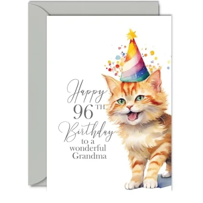 Make them smile with this special birthday card - This exceptional quality birthday card for her shows the design Party Cat Kitten saying 'Happy 96th Birthday'. If you are looking for awesome birthday greetings cards for women or 96th birthday card for her then then this happy birthday card is bound to make her smile. Not just for friendship gifts for women this could also be a birthday card for Grandma, Step Grandma, Gran, Granny or Grandma in Law. What's Inside - Print showcasing a lovely verse, 'Wishing You A Very Happy Birthday' as seen in the second image. There's ample space for your own personal message. Crafted on a 360-micron thick environmentally responsible board, this one-sided gloss board offers a luxurious look and feel. Paired with a colored gummed envelope that complements the design, it's ready to be sealed and sent, making it a truly special birthday gesture. Ink Perfection: Say goodbye to ink smudges! Our high-quality one-sided coated board ensures a smooth writing experience without the worry of smudging. The uncoated side absorbs ink, providing a flawless finish that adds to the card's overall premium quality.Grandma birthday card adults, 96th birthday card Grandma, special Grandma birthday cards, Grandma 96th birthday cards, female birthday cards. Dimensions that Impress: Greet with grandeur using a card sized at 148mm x 210mm, accompanied by an envelope measuring 150mm x 212mm. The card boasts a thickness of 360 microns, ensuring a substantial and impressive presence.Grandma birthday cards from Grandson or Granddaughter. Great Grandma card birthday, Grandma birthday cards for women, happy birthday Grandma, Grandmas birthday card adults. British Craftsmanship: Proudly crafted and quality-checked in the UK, our birthday cards are a testament to expert design and manufacturing. Utilizing Forest Stewardship Council certified board, we contribute to responsible forest management. Expect a swift turnaround and a product that reflects the highest standards of quality. Wonderful Grandma birthday cards, fabulous female birthday cards.