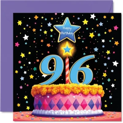 96th Birthday Cards for Men Women Pink Cake & Stars Happy Card 96 Year Old Man Woman Auntie Uncle Grandad Nanny, 145mm Bday Greeting