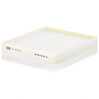 MANN-FILTER Cabin Air Filter CU 24 017 / Dimensions (mm): A = 240; B = 208; H = 28 / Premium Filter in Original Equipment Quality High-quality MANN-FILTER cabin filters offer almost 100% protection against particles such as pollen, diesel soot and tyre abrasion - for a feel-good climate in the vehicle interior and protection of the air conditioning system Exact fit and perfect tightness ensure constant filtration performance during the entire service interval / Optimum vehicle interior ventilation due to the high air flow capacity Looking to find the correct filter? Select: brand, model, vehicle type, and engine type above to see which one fits your vehicle MANN+HUMMEL complies with REACH-regulation + supports the goal of Improved health and safety through the design, manufacturing, usage, disposal and recycling of our products