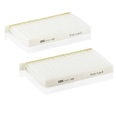 MANN-FILTER Cabin Air Filter CU 21 005-2 (set of 2) / Dimensions (mm): A = 202; B = 119; H = 20 / Premium Filter in Original Equipment Quality High-quality MANN-FILTER cabin filters offer almost 100% protection against particles such as pollen, diesel soot and tyre abrasion - for a feel-good climate in the vehicle interior and protection of the air conditioning system Exact fit and perfect tightness ensure constant filtration performance during the entire service interval / Optimum vehicle interior ventilation due to the high air flow capacity Looking to find the correct filter? Select: brand, model, vehicle type, and engine type above to see which one fits your vehicle MANN+HUMMEL complies with REACH-regulation + supports the goal of Improved health and safety through the design, manufacturing, usage, disposal and recycling of our products