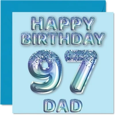MAKE YOUR DAD SMILE WITH THIS AWESOME BIRTHDAY CARD: This exceptional quality birthday card for him shows the design of blue glitter balloons stating 'Happy Birthday 97' Dad'. If you are looking for funny birthday cards for men, then then this happy birthday card is bound to make them laugh. Not just for friendship gifts for men this could also be for Dad, Step Dad or Father in Law. WHAT DO YOU GET: The card is printed on one side and BLANK ON THE INSIDE to allow you to write your very own message. The unique fun design is printed on a specially sourced and environmentally responsible board. At 360 microns thick the natural white one-sided gloss board has a quality look and feel. Supplied with a coloured gummed envelope to complement the design and ready to be sealed and sent in the post. Birthday card for Dad, 97th birthday card for him. NO INK SMUDGES: There is nothing worse than writing inside a card to find that the shiny surface makes the ink smudge. This is why we use a high quality one sided coated board. The uncoated side will absorb more of the ink from your pen to make smudging a thing of the past. Dad birthday cards, birthday card cute, 97th birthday gifts for Dad, Dad birthday cards. SIZES: Greeting Card = 145mm x 145mm, Envelope = 155mm x 155mm, Card Thickness = 360 micron. Great Dad birthday cards from Daughter and Son, male birthday card, 97th birthday card, happy birthday Dad cards, family birthday card. MADE AND QUALITY CHECKED IN THE UK: We print and manufacture all our product right her in the UK so you can be sure of a fast turnaround and a product that is expertly made. Using environmentally responsible premium board our card is conscious of the responsible management of the world's forests.